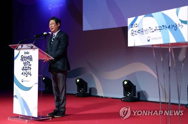 (서울=연합뉴스) 황희 문화체육관광부 장관이 22일 서울 중구 국립극장 달오름극장에서 열린 '문화예술발전 유공자 시상식'에 참석해 축사하고 있다. 2021.10.22