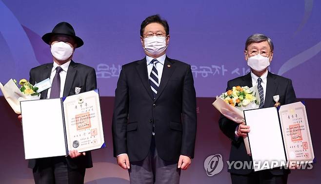 (서울=연합뉴스) 황희 문화체육관광부 장관(가운데)이 22일 서울 중구 국립극장 달오름극장에서 열린 '문화예술발전 유공자 시상식'에서 화관 문화훈장을 전수하고 수훈자와 기념 촬영을 하고 있다. 왼쪽부터 권대섭 도예가, 황희 장관, 박용현 두산연강재단 이사장. 2021.10.22