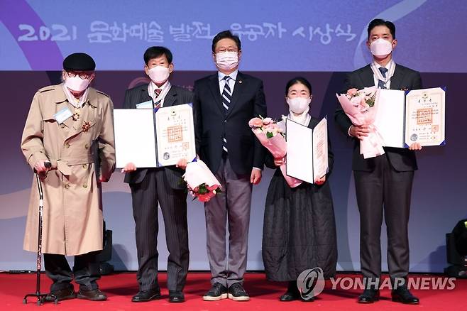 (서울=연합뉴스) 황희 문화체육관광부 장관(왼쪽 세 번째)이 22일 서울 중구 국립극장 달오름극장에서 열린 '문화예술발전 유공자 시상식'에서 은관 문화훈장을 전수하고 수훈자와 기념 촬영을 하고 있다. 왼쪽부터 김병기 화백, 김우종 전 덕성여대 교수, 황희 장관, 안숙선 명창, 고 유희경 전 이화여대 교수 가족. 2021.10.22