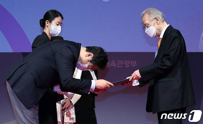 (서울=뉴스1) = 황희 문화체육관광부 장관이 22일 서울 중구 국립극장 달오름극장에서 열린 문화예술발전 유공자 시상식에서 이어령 이화여대 명예교수에게 금관 문화훈장을 전수하고 있다. (문화체육관광부 제공) 2021.10.22/뉴스1