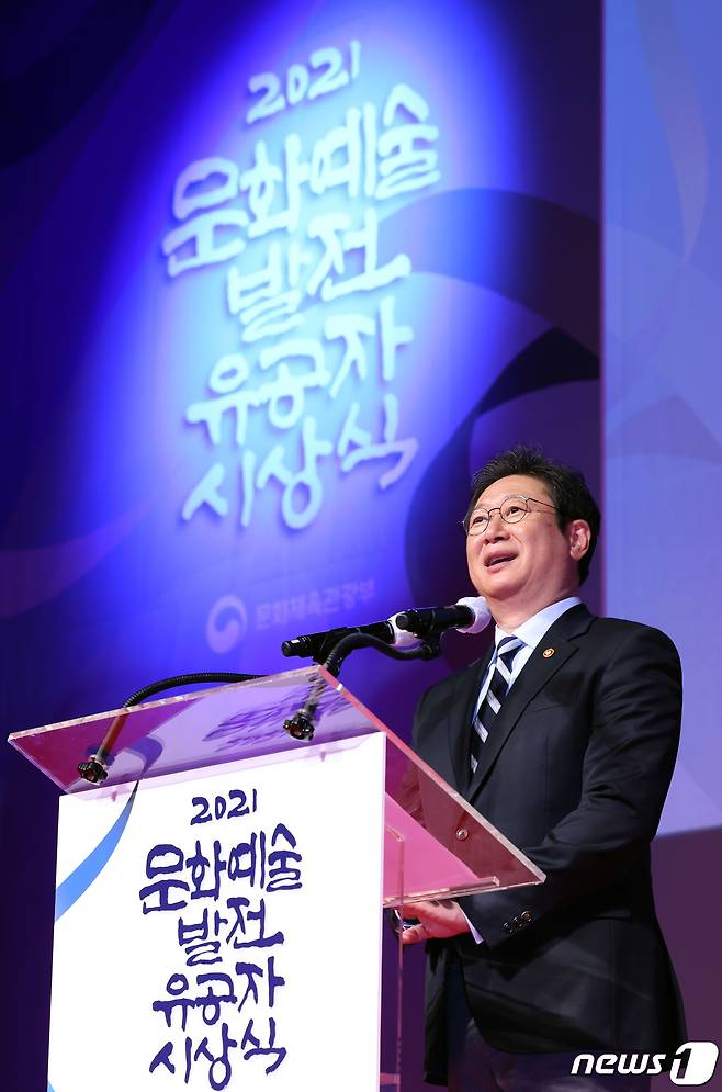 (서울=뉴스1) = 황희 문화체육관광부 장관이 22일 서울 중구 국립극장 달오름극장에서 열린 문화예술발전 유공자 시상식에서 축사하고 있다. (문화체육관광부 제공) 2021.10.22/뉴스1