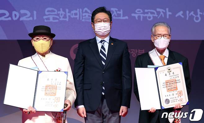 (서울=뉴스1) = 황희 문화체육관광부 장관이 22일 서울 중구 국립극장 달오름극장에서 열린 문화예술발전 유공자 시상식에서 금관 문화훈장을 전수한 뒤 기념촬영을 하고 있다 왼쪽부터 박서보 화백, 황 장관, 이어령 이화여대 명예교수. )(문화체육관광부 제공) 2021.10.22/뉴스1