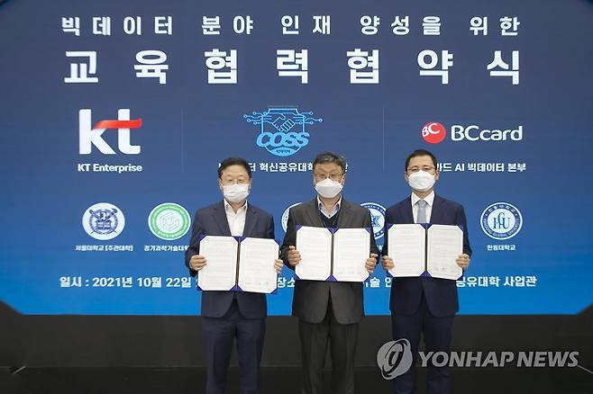 (서울=연합뉴스) KT가 BC카드, 서울대학교 빅데이터 혁신공유대학 사업단과 '빅데이터 분야 인재 양성을 위한 교육 협력 협약'을 체결했다고 22일 밝혔다.