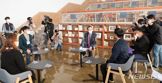 [익산=뉴시스] 김얼 기자 = 송하진 전북도지사가 22일 전북 익산시 스마트팜 혁신밸리 공사현장을 찾아 간담회를 갖고 관계자들 대화를 나누고 있다. 2021.10.22. pmkeul@newsis.com