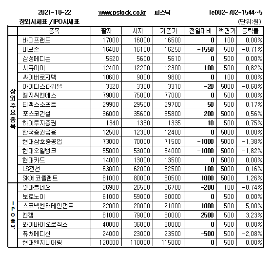보로노이(6만원), 와이바이오로직스(3만8000원), 바디프랜드(1만6500원), 에이프로젠(2만4000원), 엔쓰리엔(1300원), 비씨켐(5만4000원), 노바셀테크놀로지(8600원), 에스바이오메딕스(9000원) 등 장외종목은 주가변동없이 장을 마감했다.