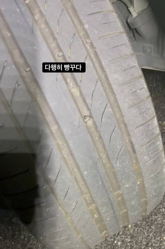 이혜정은 바람 빠진 타이어와 함께 "다행히 빵꾸다"라고 글을 남기며 안도하는 모습을 보였다.