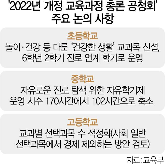 교육부와 국가교육과정 개정추진위원회는 22일 ‘2022 개정 교육과정 총론 주요사항 마련을 위한 공청회’를 열어 그동안의 연구 결과를 공개하고 학생·교사·학부모 등의 의견을 수렴했다.