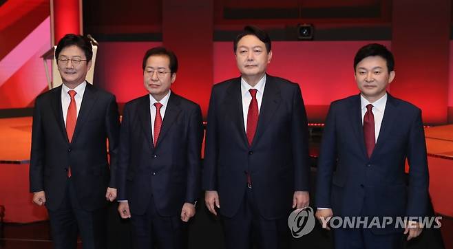 (서울=연합뉴스) 하사헌 기자 = 국민의힘 유승민(왼쪽부터), 홍준표, 윤석열, 원희룡 대선 경선 후보가 22일 오후 서울 마포구 YTN뉴스퀘어에서 열린 국민의힘 대선 경선 제6차 토론회 2차 맞수토론에 앞서 포즈를 취하고 있다. 2021.10.22