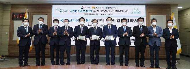 o 산림청 최병암 청장과 전라남도 김영록 도지사, 완도군 신우철 군수가 참석한 가운데 체결한 이번 업무협약은 한반도 아열대화 기후변화 대응과 난·아열대 산림생물자원 보전을 위한 국립난대수목원 조성사업을 효율적으로 추진하기 위해 마련하였다.