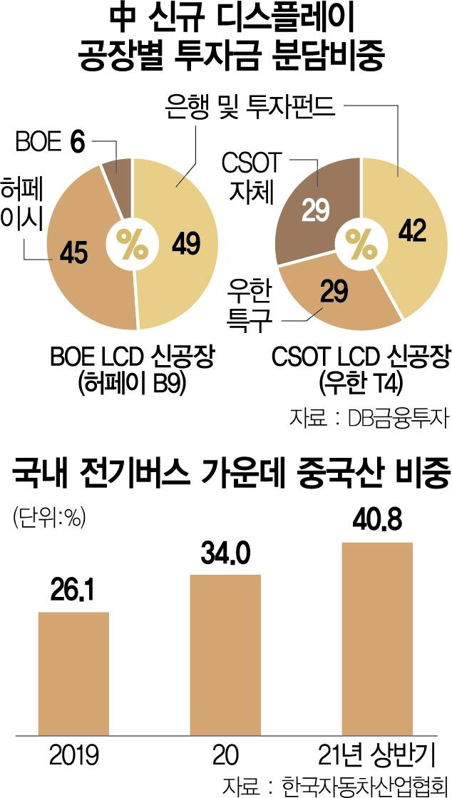 국내 자동차 시장에서는 저가·물량 공세를 펼치는 중국산 전기버스가 점유율을 확대하고 있다. 한국자동차산업협회(KAMA)에 따르면 올 상반기 판매된 전기버스 중 중국산 비중은 40.8%에 달한다. 2019년 26.1%에 이어 지난해 34.0%를 기록한 후 꾸준히 점유율이 올라가고 있다. 전기버스는 자국 정부의 보조금에 힘입은 중국산이 한국산보다 약 1억 원 정도 저렴해 인기가 높다.