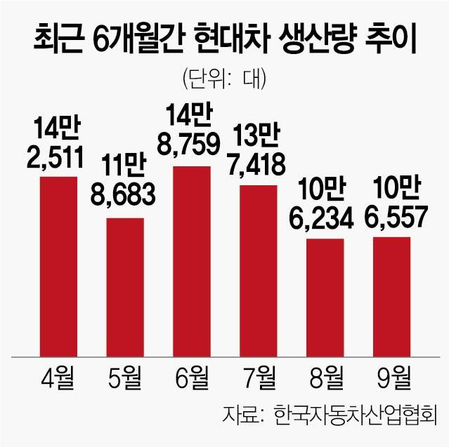 다만 현대차그룹 안팎에서는 10월부터 분위기가 반전될 것이라는 전망도 적지 않았다. 15일 호세 무뇨스 현대차 글로벌 최고운영책임자(COO) 겸 북미권역본부장이 외신과의 인터뷰를 통해 “차량용 반도체 칩 부족에 따른 최악의 상황은 지나갔다”며 11월 생산 정상화에 대한 기대감을 전한 바 있다. 그에 앞서 하언태 현대차 사장도 노조와 만나 연말 생산량 확대를 독려한 것으로 알려졌다.