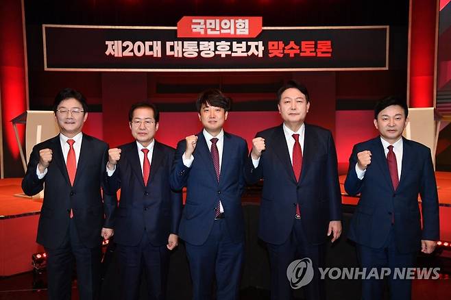 (서울=연합뉴스) 하사헌 기자 = 국민의힘 유승민(왼쪽부터), 홍준표 대선 경선 후보, 이준석 대표, 윤석열, 원희룡 대선 경선 후보가 22일 오후 서울 마포구 YTN뉴스퀘어에서 열린 국민의힘 대선 경선 제6차 토론회 2차 맞수토론에 앞서 포즈를 취하고 있다. 2021.10.22