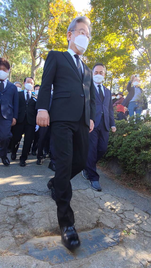 이재명 더불어민주당 대선 후보가 22일 광주 5·18 구묘역(민족민주열사묘역)을 참배하고 나오면서 전두환 비석을 밟고 있다. 이 후보는 윤석열 국민의힘 대선 예비 후보를 겨냥해 “(전두환을) 존경하는 분이니 못 밟았겠네”라고 비꼬았다./광주=연합뉴스