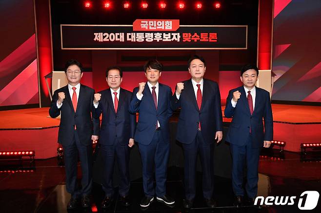 (서울=뉴스1) 국회사진취재단 = 국민의힘 이준석 대표와 대선 예비후보들이 22일 오후 서울 마포구 상암동 YTN에서 대선 경선 6차 토론회를 앞두고 기념촬영을 하고 있다. 왼쪽부터 유승민, 홍준표 후보, 이 대표, 윤석열, 원희룡 후보. 2021.10.22/뉴스1