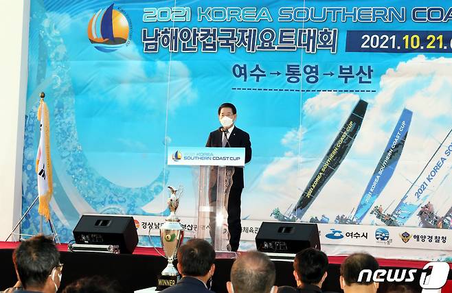 (여수=뉴스1) 전원 기자 = 김영록 전라남도지사가 22일 여수 웅천 원형마리나에서 열린 ‘2021 남해안컵 국제요트대회 개막식에서 환영사를 하고 있다.(전남도 제공) 2021.10.22/뉴스1