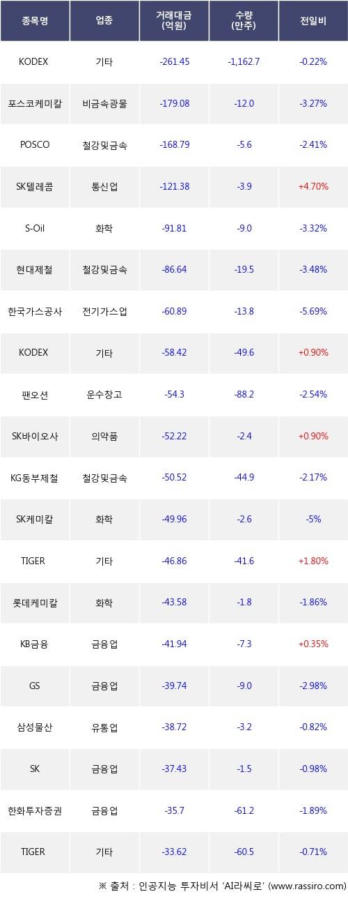 기관 투자자의 순매도 상위 20개 종목은 KODEX 200선물인버스2X, 포스코케미칼, POSCO, SK텔레콤, S-Oil, 현대제철, 한국가스공사, KODEX K-메타버스액티브, 팬오션, SK바이오사이언스등이다.