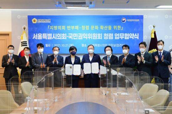 서울시의회(의장 김인호)는 반부패·청렴 정책의 주부무처인 국민권익위원회(전현희 위원장)와 21일 서울특별시의회 의장실에서 '지방의회 반부패·청렴문화 확산'을 위한 업무협약을 체결했다.