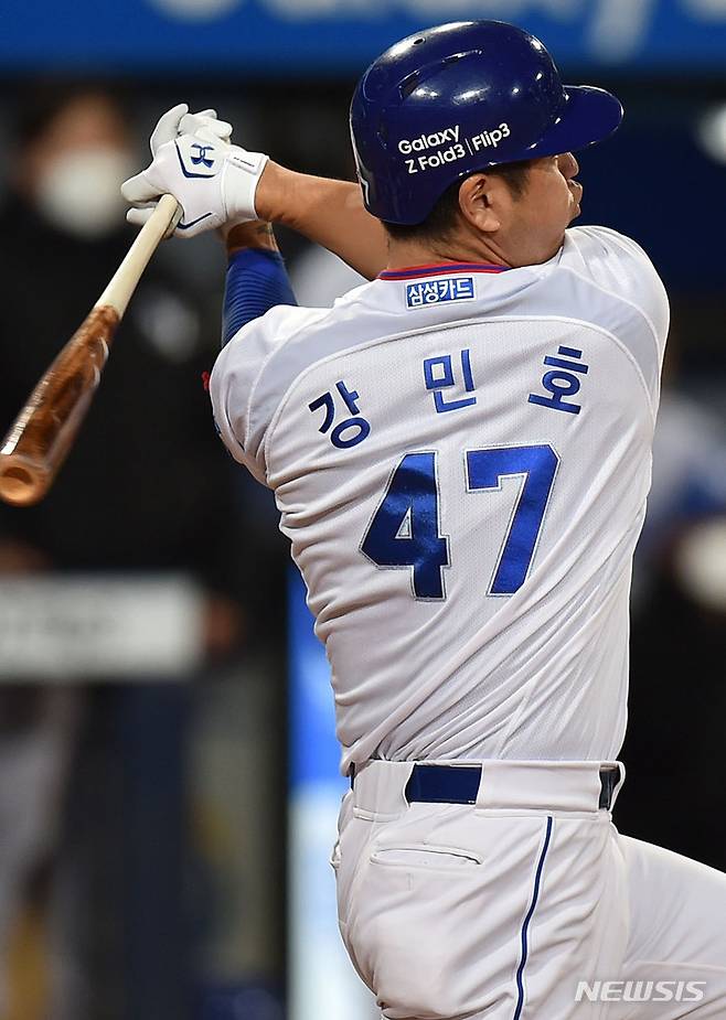 [대구=뉴시스] 이무열 기자 = 22일 오후 대구 수성구 삼성라이온즈파크에서 열린 ‘2021 신한은행 SOL KBO리그’ 삼성 라이온즈와 KT 위즈의 경기, 4회말 무사 주자 1,2루 상황에서 삼성 강민호가 좌익수 앞 1타점 적시타를 날리고 있다. 2021.10.22. lmy@newsis.com