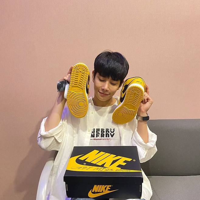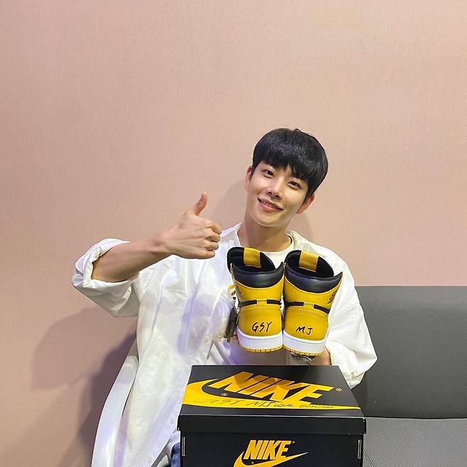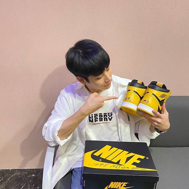공개된 사진엔 모 브랜드 운동화를 든 MJ의 모습이 담겼다. 신발과 박스에 'G.S.Y', 'M.J', 'with zerotak'이라고 적힌 문구가 눈길을 끈다.
