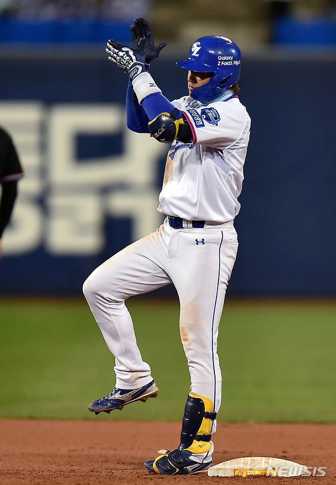 [대구=뉴시스] 이무열 기자 = 22일 오후 대구 수성구 삼성라이온즈파크에서 열린 ‘2021 신한은행 SOL KBO리그’ 삼성 라이온즈와 KT 위즈의 경기, 4회말 무사 주자 만루 상황에서 삼성 김상수가 좌중간 싹쓸이 3타점 적시 2루타를 날린 후 기뻐하고 있다.2021.10.22. lmy@newsis.com