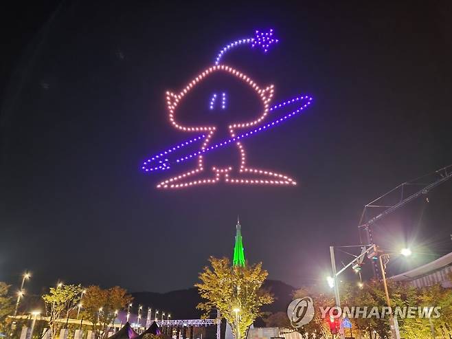 (대전=연합뉴스) 김준호 기자 = 과학을 주제로 한 축제인 '2021 대전사이언스페스티벌'이 22일 개막해 오는 26일까지는 온라인 행사 중심으로, 다음 달 13∼14일은 다양한 시민참여 행사로 진행된다. 이날 개막식에서 250여대의 드론이 비행하며 화려한 라이팅쇼를 선보이고 있다. 2021.10.22
