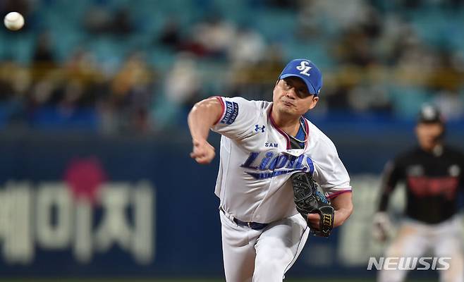 [대구=뉴시스] 이무열 기자 = 22일 오후 대구 수성구 삼성라이온즈파크에서 열린 ‘2021 신한은행 SOL KBO리그’ 삼성 라이온즈와 KT 위즈의 경기, 8회초 2사 1루 상황에서 등판한 삼성 마무리 투수 오승환이 역투하고 있다. 2021.10.22. lmy@newsis.com