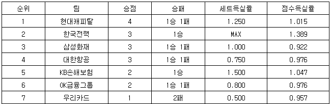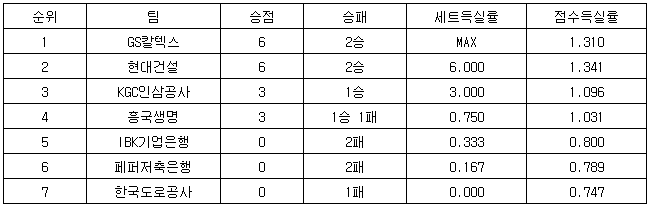 ※순위는 승점-승리 경기 수-세트득실률(총 승리세트/총 패배세트)-점수득실률(총 득점/총 실점) 순.