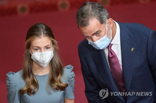 epa09538847 Spain's King Felipe VI (R) and Crown Princess Leonor (L) before an audience granted by the Spanish royal family to the Princess of Asturias Awards 2021 laureates at the Reconquista Hotel in Oviedo, Asturias, Spain, 22 October 2021. The Princess of Asturias awarding ceremony will be taking place at Campoamor Theater in Oviedo later in the day. EPA/Eloy Alonso