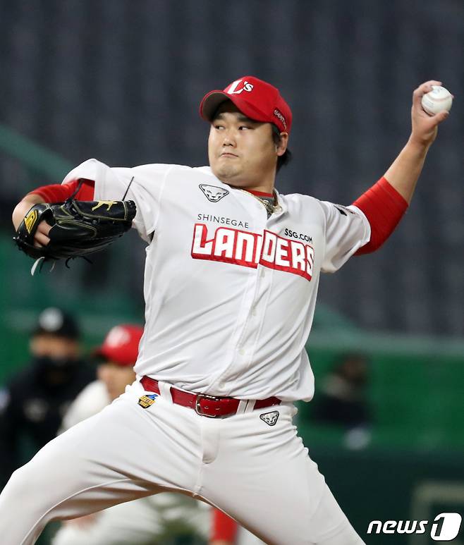 (인천=뉴스1) 김명섭 기자 = 22일 오후 인천 미추홀구 SSG 랜더스필드에서 열린 프로야구 '2021 신한은행 SOL KBO리그' 두산 베어스와 SSG랜더스의 경기에서 7회초 SSG 교체투수 김태훈이 역투하고 있다. 2021.10.22/뉴스1