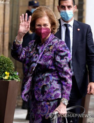 epa09538852 Spain's Emeritus Queen Sofia arrives at the Reconquista hotel in Oviedo, Asturias, Spain, 22 October 2021, where she will be attending the Princess of Asturias Awarding ceremony later in the day. EPA/Paco Paredes