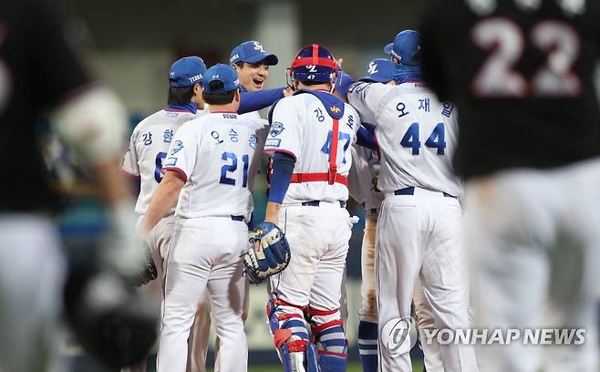 (대구=연합뉴스) 김현태 기자 = 22일 오후 대구 삼성라이온즈파크에서 열린 프로야구 '2021 프로야구 신한은행 SOL KBO리그' kt wiz와 삼성 라이온즈의 경기에서 삼성이 4:2로 승리 후 선수들이 기뻐하고 있다. 2021.10.22