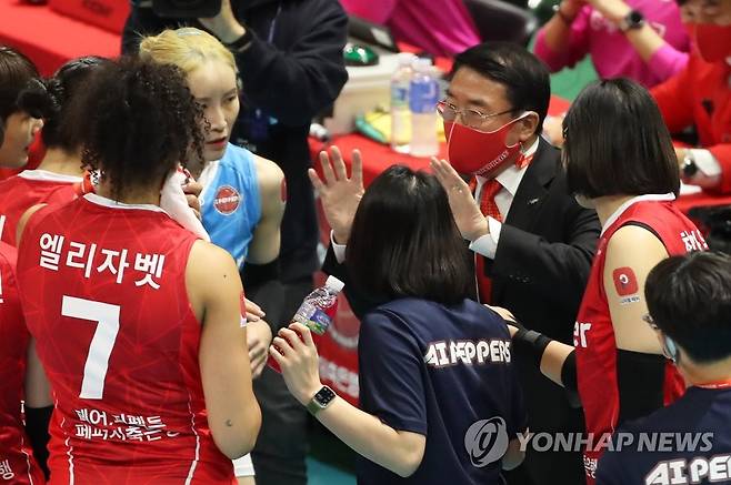 (광주=연합뉴스) 조남수 기자 = 22일 광주 염주종합체육관(페퍼스타디움)에서 열린 프로배구 V리그 여자부 페퍼저축은행과 GS칼텍스 경기에서 페퍼저축은행 김형실 감독이 작전을 지시하고 있다. 2021.10.22