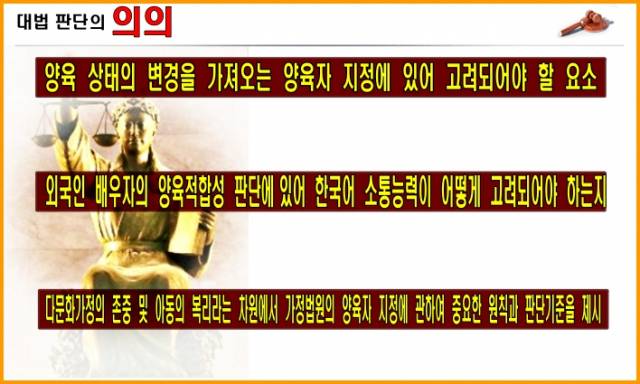 대법원 관계자는 "양육상태의 변경을 가져오는 양육자 지정은 이를 정당화할만한 사유가 명백해야 하고, 특히 외국인 배우자가 한국어 소통능력이 부족하다고 해 양육적합성이 떨어질 것이라는 추상적이고 막연한 판단에 근거해 양육자 지정을 해서는 안 된다"는 판단의 의의를 가진 판결임을 강조했다.