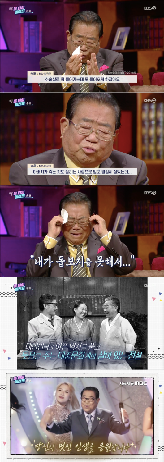 송해의 아들은 오토바이사고가 나서 떠났다고. “작은 수술실 틈으로 보는데 ‘아버지 살려줘 살려줘’하는 소리가 들렸다. 아버지가 죽는 것도 살리는 사람으로 알고 열심히 살았는데 내가 돌보지를 못했다”라며 진한 부정을 보였다.