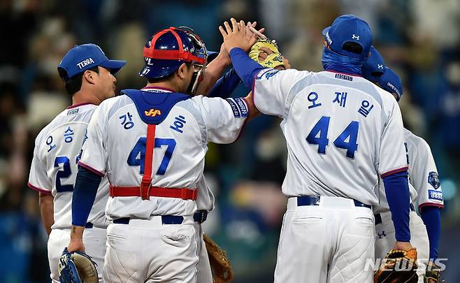 [대구=뉴시스] 이무열 기자 = 22일 오후 대구 수성구 삼성라이온즈파크에서 열린 ‘2021 신한은행 SOL KBO리그’ 삼성 라이온즈와 KT 위즈의 경기, 삼성 선수들이 4대2로 승리한 뒤 기뻐하고 있다. 2021.10.22. lmy@newsis.com