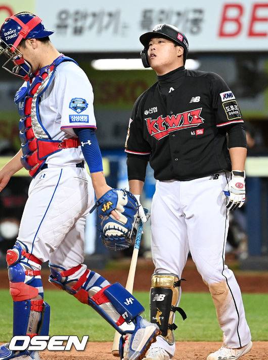 8회초 1사 주자 1루 KT 강백호가 타석에서 삼진아웃을 당한 후 아쉬워하고 있다.2021.10.22 / rumi@osen.co.kr
