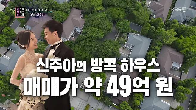 2위는 태국댁 신주아다. 신주아의 남편 중국계 태국인 쿤서방은 연 매출 400억원 태국 페인트 회사 경영인 2세. 두 사람은 친구의 소개로 만나게 됐다고. 결혼 후 태국으로 이주한 신주아는 현재 방콕 고급 주택 빌리지에 거주 중이다. 집이 너무 넓어 단지 안에서 킥보드 타고 다녀야 할 정도로 궁궐급 규모를 자랑하는 이 집은 매매가 약 49억원이다.