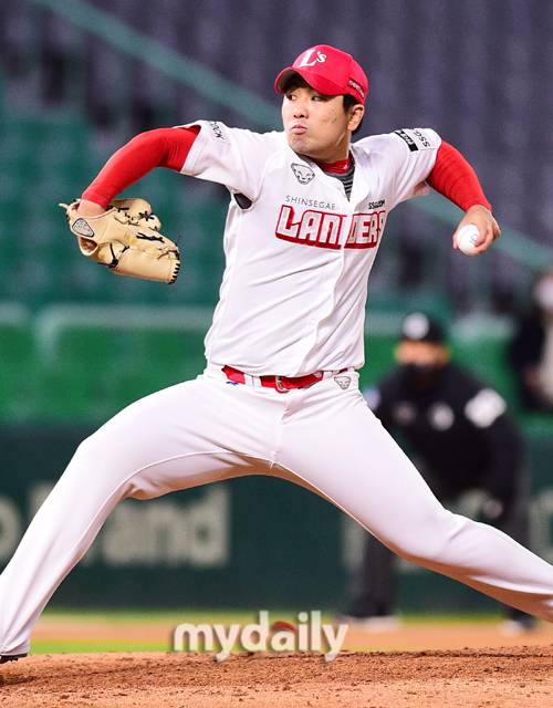[마이데일리 = 인천 곽경훈 기자] SSG 김택형이 22일 오후 인천 SSG랜더스필드에서 진행된 '2021 신한은행 SOL KBO리그' 두산-SSG의 경기 8회초 2사 만루에서 구원 등판해 역투를 펼치고 있다.- ⓒ마이데일리(www.mydaily.co.kr). 무단전재&재배포 금지 -