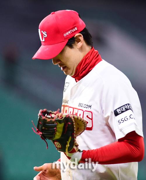 [마이데일리 = 인천 곽경훈 기자] SSG 1루수 오태곤이 22일 오후 인천 SSG랜더스필드에서 진행된 '2021 신한은행 SOL KBO리그' 두산-SSG의 경기 8회초 2사 만루에서 페르난데스의 타구를 호수비로 처리한 뒤 덕아웃으로 향하고 있다.- ⓒ마이데일리(www.mydaily.co.kr). 무단전재&재배포 금지 -