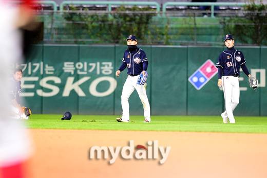 [마이데일리 = 인천 곽경훈 기자] 두산 안권수,강승호,조수행이 22일 오후 인천 SSG랜더스필드에서 진행된 '2021 신한은행 SOL KBO리그' 두산-SSG의 경기 8회말 1사 1루에서 최지훈의 타구를 놓친 뒤 아쉬워 하고 있다.- ⓒ마이데일리(www.mydaily.co.kr). 무단전재&재배포 금지 -