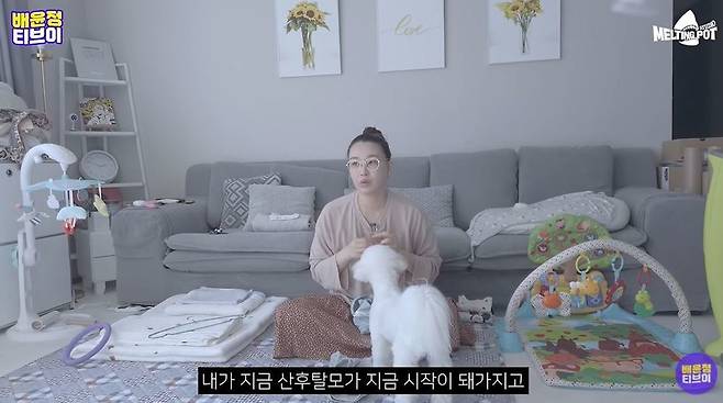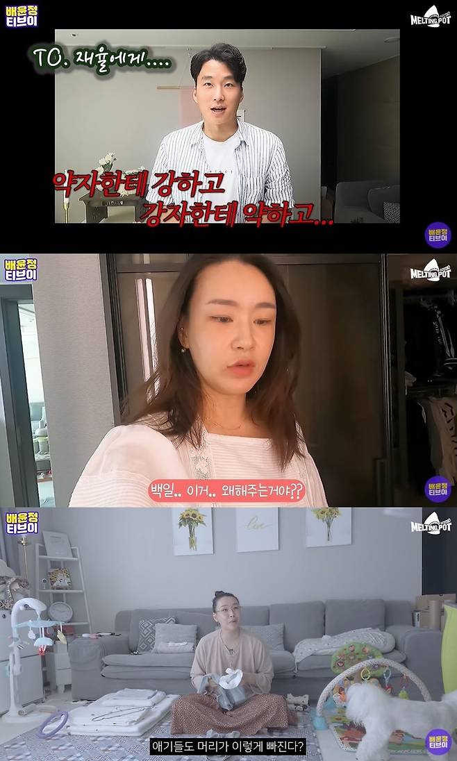 이후 다른 날, 집안일하면서 제일 스트레스받는 것이 무엇이냐는 질문에 배윤정은 "내가 지금 산후탈모가 시작돼서 머리카락을 치워도 치워도 계속 나온다"라고 털어놓았다. 또한 아들도 배냇머리가 빠지기 시작해 "계속 허리 숙여가지고 머리카락 집고 하니까 그런 게 많이 힘들다"라고 밝혔다. (사진= 유튜브 채널 '배윤정TV' 캡처)