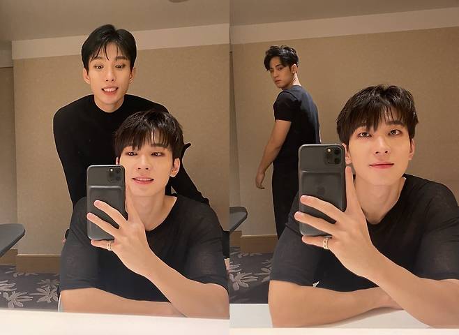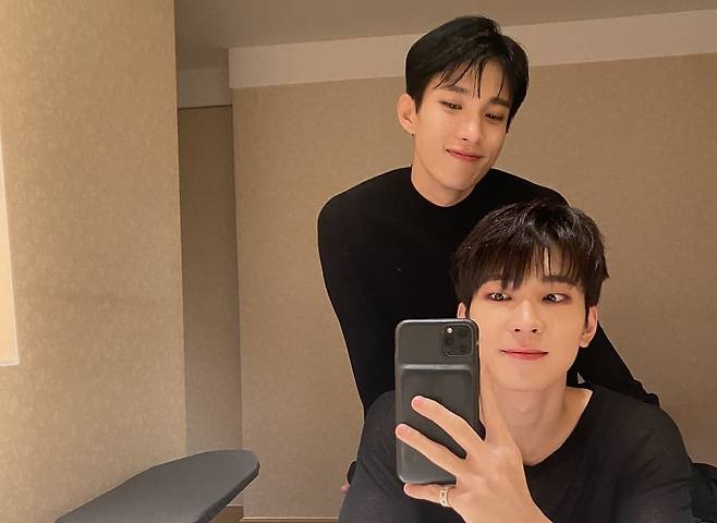 사진 속 원우는 거울 앞에 앉아 셀카를 찍는 모습이다. 원우의 뒤에 등장한 도겸은 장난기 가득한 표정으로 그와 함께 했다. 도겸은 "나 그만 좋아해.."라는 댓글을 남겨 폭소케 했다.