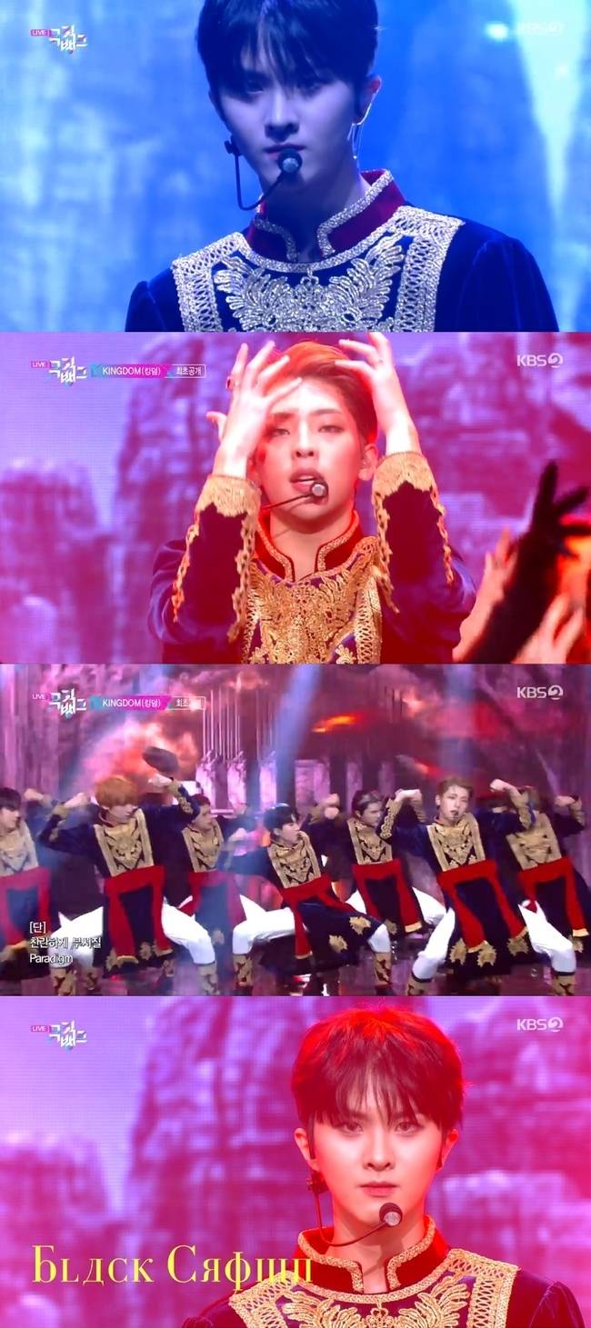 킹덤은 '뮤직뱅크'에서 고풍스러운 매력이 느껴지는 금빛과 붉은색의 의상을 입고 'Black Crown' 무대를 선보여 보는 재미를 더했다. 특히 이십여명의 댄서들과 함께한 초대형 퍼포먼스는 연말 가요 시상식을 방불케 해 눈길을 사로잡았다.