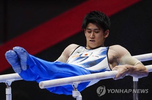 epa09538973 Daiki Hashimoto of Japan performs on the Parallel Bars during the Men's All-Around Final at the 50th FIG Artistic Gymnastics World Championships in Kitakyushu, Japan, 22 October 2021. EPA/KIMIMASA MAYAMA