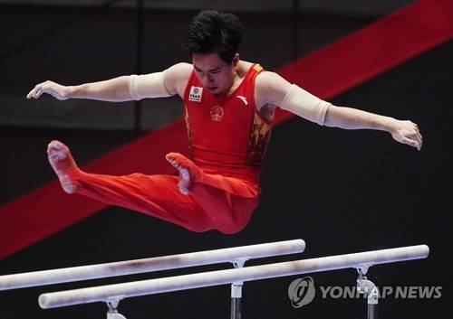 epa09538975 Zhang Boheng of China performs on the Parallel Bars during the Men's All-Around Final at the 50th FIG Artistic Gymnastics World Championships in Kitakyushu, Japan, 22 October 2021. EPA/KIMIMASA MAYAMA