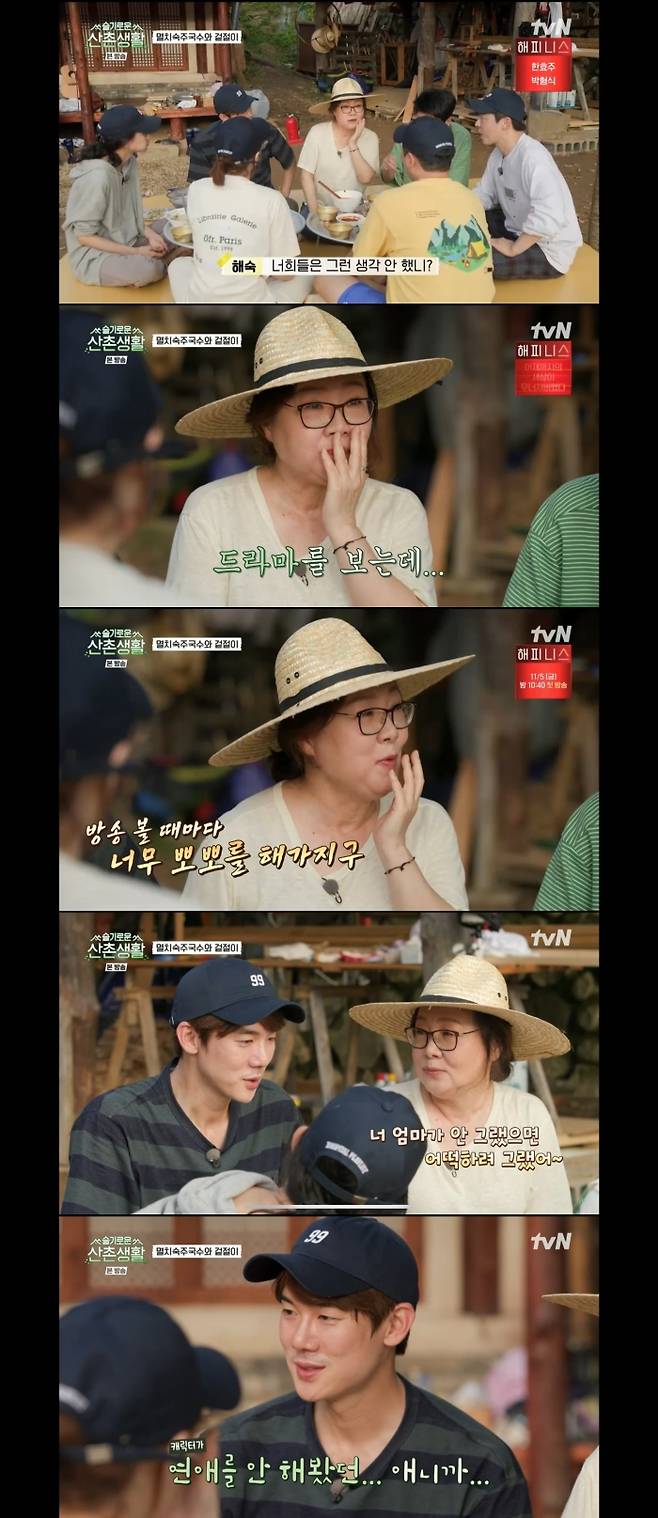 22일 방송된 tvN '슬기로운 산촌생활'에서는 유연석이 촬영을 마치고 뒤늦게 합류하고, 이어 김해숙까지 합류하는 하루가 그려졌다.