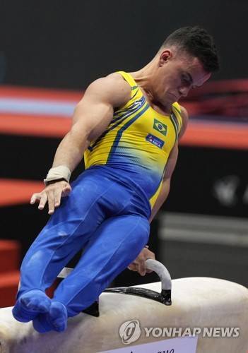 epa09539084 Caio Souza of Brazil performs on the pommel horse during the Men's All-Around Final at the 50th FIG Artistic Gymnastics World Championshi?ps in Kitakyushu, Japan, 22 October 2021. EPA/KIMIMASA MAYAMA