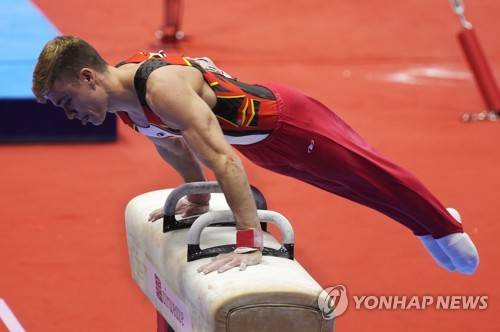 epa09539082 Joel Plata of Spain performs on the pommel horse during the Men's All-Around Final at the 50th FIG Artistic Gymnastics World Championshi?ps in Kitakyushu, Japan, 22 October 2021. EPA/KIMIMASA MAYAMA
