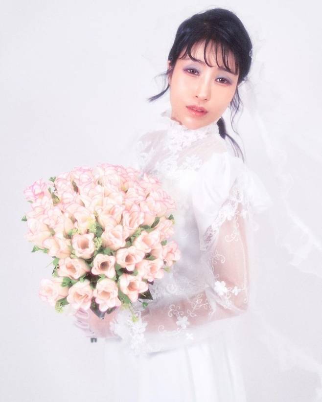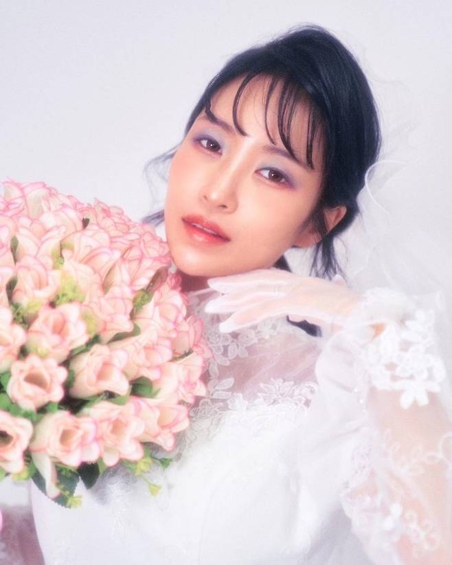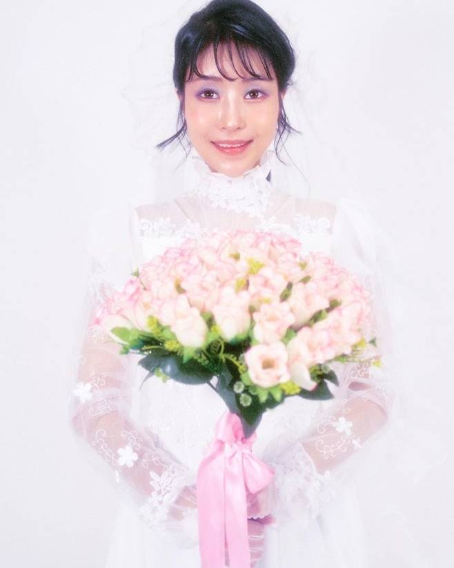 사진엔 웨딩드레스를 입고 결혼식 부케를 손에 든 이세영의 모습. 아련한 느낌의 표정과 화질이 레트로한 분위기를 자아냈다.