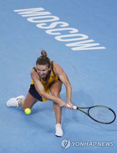 epa09539132 Maria Sakkari of Greece in action during the women's quarterfinal match against Simona Halep of Romania at the Kremlin Cup tennis tournament in Moscow, Russia, 22 October 2021. EPA/YURI KOCHETKOV